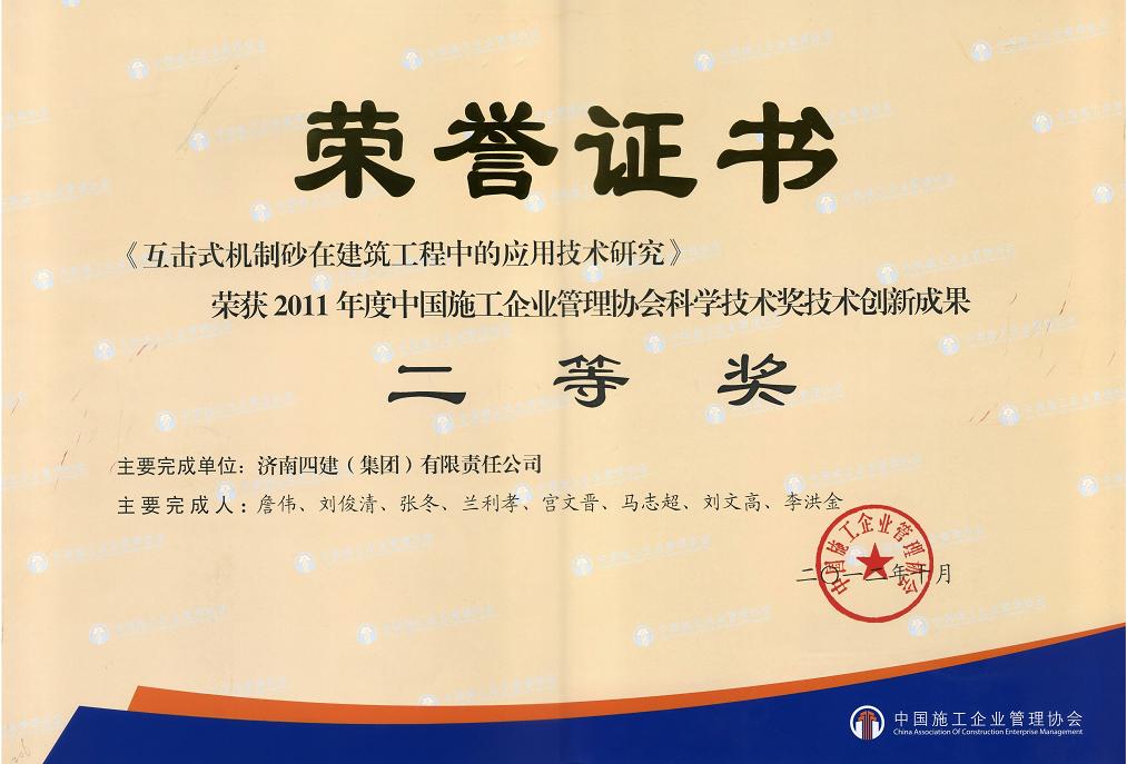 會議頒發了2011年度中國施工企業管理協會科學技術獎,我公司《互擊式機制砂在建筑工程中的應用技術研究》榮獲科技成果類二等獎。