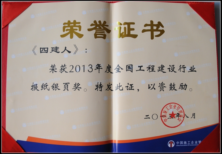 9月初,在中國施工企業管理協會主辦的“2013年度全國工程建設行業‘金銀頁’報刊評選”活動中,集團公司《四建人》報紙榮獲“全國工程建設行業‘銀頁’報刊”榮譽稱號。
