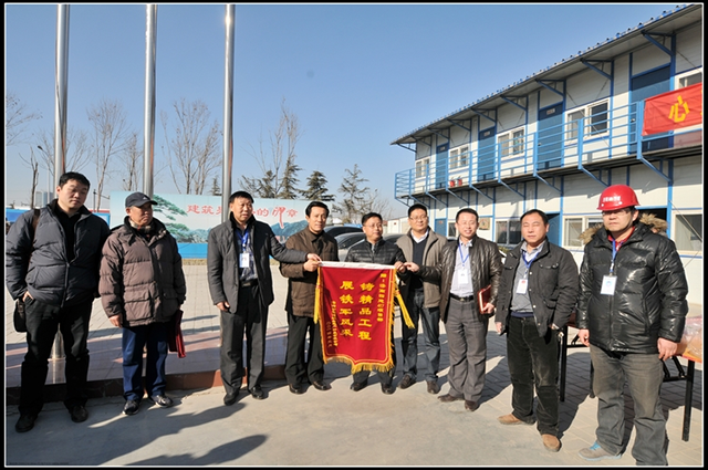 1月21日上午,濟南金科西城房地產開發有限公司工程部經理田雨春、項目總監孫慶衛等一行代表金科總部為金科西城項目工地送來“鑄精品工程展鐵軍風采”的錦旗,并送來新年的慰問。集團公司副總經理劉俊清、項目部經理公茂軍等參加活動。