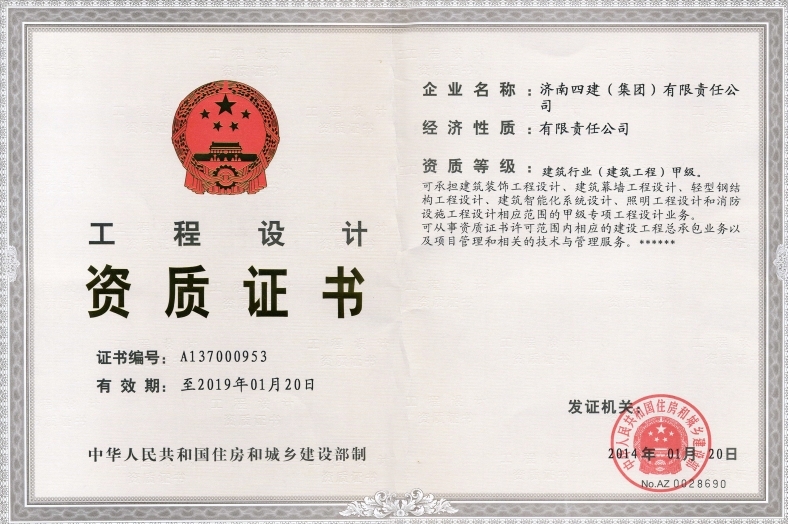 2014年1月23日,中華人民共和國住房和城鄉建設部發布公告,公告核準集團公司申報的建筑行業(建筑工程)甲級設計資質。至此,歷時一年多的設計資質申報工作取得圓滿成功。