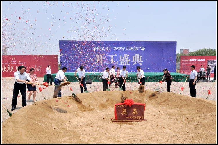 濟南市副市長王新文宣布奠基儀式正式開始。隨后,鑼鼓喧天、鞭炮齊鳴,樁基啟動,參加儀式的各位領導共同為文體廣場項目奠基培土。