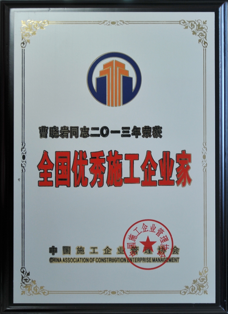 2014年10月29日,在北京召開的“2014年全國施工企業領軍人物峰會”上,集團公司董事長曹曉巖榮獲“全國優秀施工企業家”榮譽,全國有200多家施工企業參與此次評選活動。