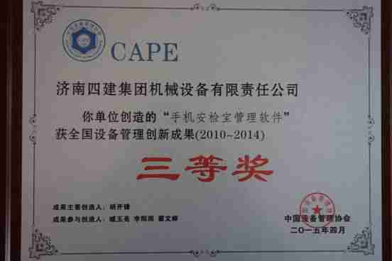 為了總結推廣設備管理創新成果,鼓勵和引導企業積極推進設備管理創新,增強企業創新驅動發展動力,中國設備管理協會日前在北京召開了全國設備管理創新成果發布表彰大會,由濟南四建集團機械設備有限責任公司創造使用的“手機安檢寶管理軟件”榮獲全國設備管理創新成果(2010年至2014年)三等獎。