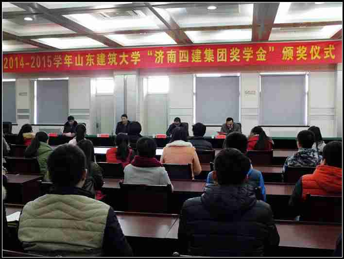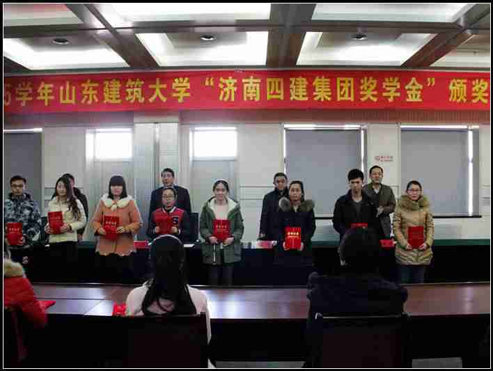 12月16日下午,2014-2015年度山東建筑大學“濟南四建獎學金”頒獎儀式在山東建筑大學辦公樓5樓會議室圓滿舉行。集團公司黨委副書記趙吉剛、人事處處長范宗宇、山東建筑大學黨委副書記韓鋒、學生處處長趙明吉出席了頒獎儀式。儀式由山東建筑大學學生處處長趙明吉主持。