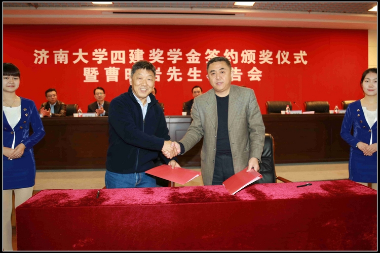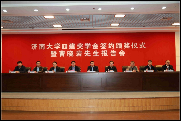 11月9日,濟南大學四建獎學金簽約頒獎儀式暨曹曉巖先生報告會在濟南大學第一學術報告廳成功舉行。集團公司黨委書記、董事長曹曉巖,黨委副書記、工會主席趙吉剛,人事處處長范宗宇等參加儀式,濟南大學校長張士強,副校長王志,土木建筑學院院長邱立平出席了會議,學校相關職能部門負責人以及土木建筑學院部分師生代表參加了簽約頒獎儀式。