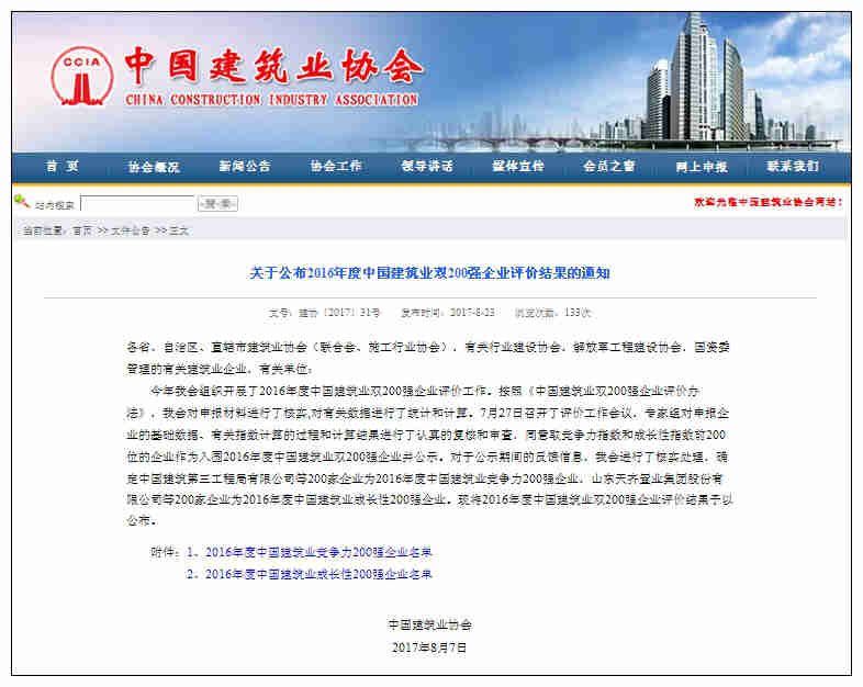 8月23日,中國建筑業協會網站正式發布建協[2017]31號文件,“關于公布2016年度中國建筑業雙200強企業評價結果的通知”。確定:濟南四建(集團)有限責任公司等200家企業為2016年度中國建筑業成長性200強企業,且集團公司位居第26位。這是集團公司連續第7年獲此殊榮,彰顯出企業卓越的成長優勢和綜合實力。