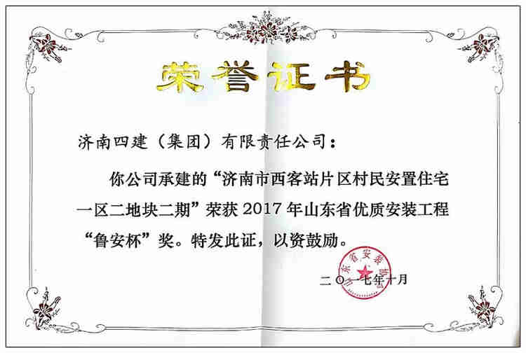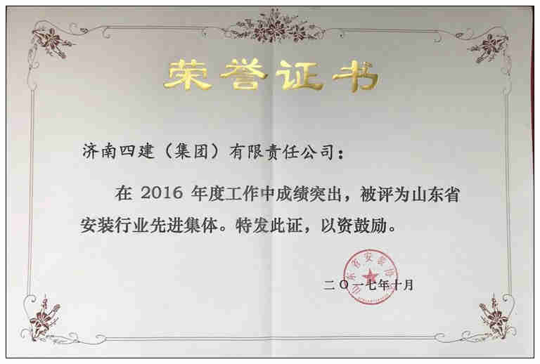 會上,為了表揚先進、樹立典型,充分激發和調動各方面的積極性、創造性,推動全省安裝行業平穩較快發展,表彰了一批優秀的集體及個人。濟南四建(集團)有限責任公司、濟南四建集團智能消防工程有限責任公司雙雙榮獲“山東省安裝行業先進集體”;由濟南四建集團安裝工程總公司承建的“濟南市西客站片區村民安置住宅一區二地塊二期”工程和濟南四建集團智能消防工程有限責任公司承建的“四建.金海花園”工程榮獲2017年度山東省優質安裝工程“魯安杯”獎。常傳兵、劉清杰、王宏昕、趙潔、于立芹等同志被評為2016年度“山東省安裝行業優秀項目經理”。