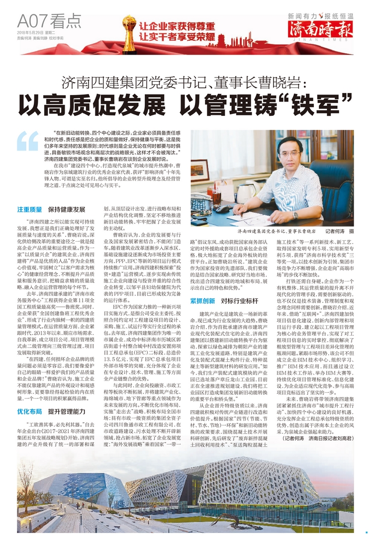 【摘自濟南日報A2版】“在新舊動能轉換、四個中心建設之際,企業家必須具備責任感和時代感,責任感是把企業的質和量做好,保持健康與平衡,這是我們多年來堅持的發展原則;時代感則是企業無論在何時都要與時俱進,具備敏銳市場觀念和高層次的戰略眼光,這樣才不會被淘汰。”濟南四建集團黨委書記、董事長曹曉巖在談到企業發展時說。