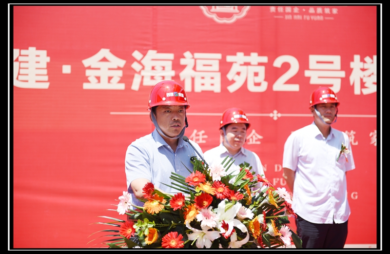 徐總首先介紹了金海福苑項目的概況和定位,金海福苑項目是四建地產繼金海花園之后在集團內部繼續實施“自主開發-自主建設-自主服務”全產業鏈運營模式的又一升級力作。徐總隨后指出,自項目奠基以來,在集團的大力支持下,地產與三項目公司、409項目部及眾參建單位本著“一盤棋、一家人、一條心”的原則,陸續完成了各項施工任務,保障了計劃節點的按時達成。6月19日,在曹董事長的帶領下,集團在工地現場召開了第二次金海福苑項目現場調度會,進一步明確了福苑下步的各項建設目標。徐總要求各參建單位要以今天的封頂儀式當做新的起點,繼續保持不驕不躁、艱苦奮斗的工作作風,繼續發揚團結協作、銳意進取的工作精神,為全面完成福苑的各項工作目標而不懈努力,為濟陽貢獻一座實實在在的精品工程!
