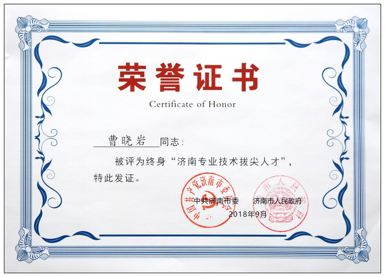 曹曉巖董事長被評為終身“濟南專業技術拔尖人才”