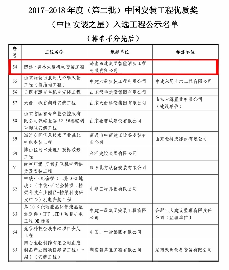 11月26日,中國安裝協會發布“2017-2018年度(第二批)中國安裝工程優質獎(中國安裝之星)評審結果”,由濟南四建集團智能消防工程有限責任公司承建的四建?美林大廈機電安裝工程,榮獲“2018年度中國安裝工程優質獎(中國安裝之星)”榮譽稱號,且在山東省建筑行業申報企業中綜合排名第一。這是集團公司首次斬獲機電安裝專業國家級獎項,也是企業“集團化”發展戰略在專業領域的再次突破。