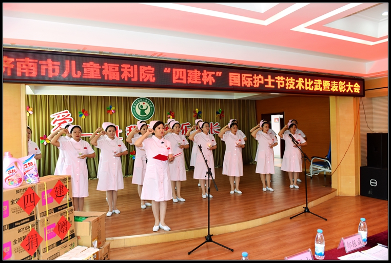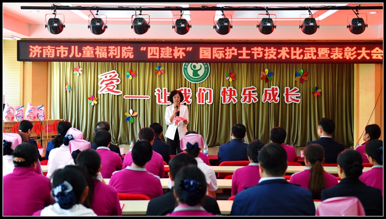 隨后,召開了濟南市兒童福利院“四建杯”國際護士節技術比武暨表彰大會,并對技術比武中獲得優異成績的先進護理工作者進行了表彰獎勵。會上,李主席代表集團公司做了講話,她首先向廣大護理工作者們提前致以節日的問候,向福利院的小朋友們表示親切的慰問,并向受到表彰的先進典型表示衷心地祝賀!李主席在講話中指出,這是我們第二次來到濟南市兒童福利院開展愛心公益活動,雖然這些孩子們遭遇不幸,但整個社會就是他們的家,只要我們人人獻出一份愛心,溫暖幸福就會陪伴在他們身邊,讓他們重新燃起人生的希望。同時,希望我們廣大的護理工作者以人為本,大力弘揚南丁格爾救死扶傷的人道主義精神和為護理事業無私奉獻的高尚品質,加強基礎護理知識的掌握和運用,提高標準化、專業化服務水平,使孤殘兒童獲得更優質的親情服務,多給他們一些鼓勵,教會他們一些生存技能。最后,她指出,濟南四建集團作為我市慈善事業的參與者,始終關心、參與、支持慈善事業,面向企業和社會,服務困難職工,廣泛宣傳慈善公益文化,積極參與公益活動,以精準扶貧為抓手,在扶貧、助殘、濟困、助學等活動中奉獻愛心,我們將以實際行動展示濟南四建集團責任國企的社會擔當,為社會福利事業持續健康發展助力。