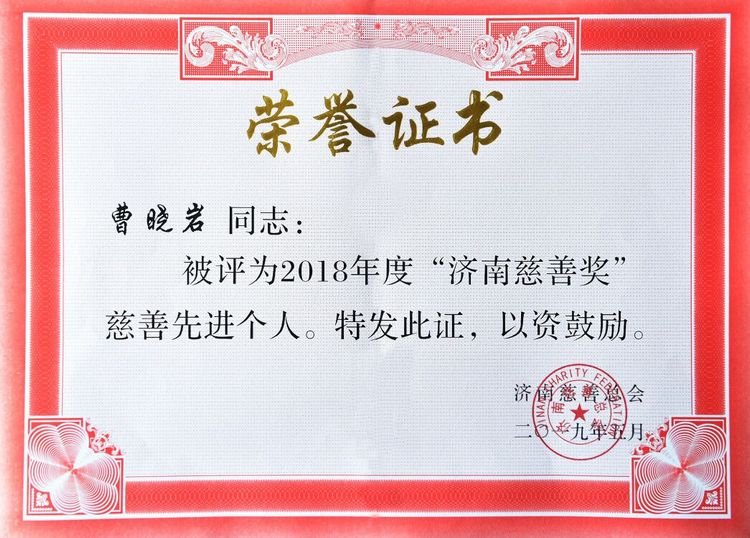 近日,集團公司被濟南市慈善總會授予2018年度“濟南慈善獎”特別貢獻獎、2018年度“濟南慈善獎”愛心捐贈單位等榮譽稱號。曹曉巖董事長被濟南市慈善總會授予2018年度“濟南慈善獎”慈善先進個人榮譽稱號。