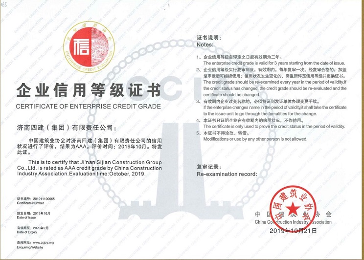 集團公司公司已連續三度獲得全國建筑業AAA級信用企業,并且名次連年上升,穩居前列。連續多年榮獲該獎項充分體現了集團公司強化信用體系建設、樹立企業品牌形象,提高工程質量和安全管理水平以及良好的發展勢頭等方面在行業中的突出表現。