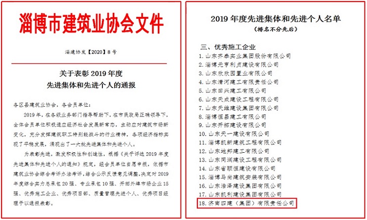 2020年3月,淄博市建筑業協會公布表彰了“2019年度先進集體和先進個人”的通知,濟南四建(集團)有限責任公司榜上有名,在淄博建筑市場獲得“優秀施工企業”殊榮。淄博市住房和城鄉建設保障服務中心公布表彰了“2019年度全市住建領域農民工工資治欠保支專項工作優秀項目和先進個人”的通知,集團公司再次金榜題名,集團第六工程項目公司承建的淄博碧桂園中房天璽9-13#、15-16#樓及地下車庫工程,在淄博住建領域榮獲“全市住建領域農民工工資治欠保支專項工作優秀項目”。這是自2017年起連續三年被評為淄博住建領域“全市住建領域農民工工資治欠保支專項工作優秀項目”。