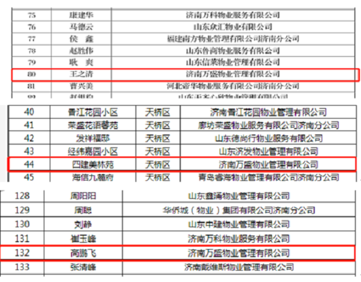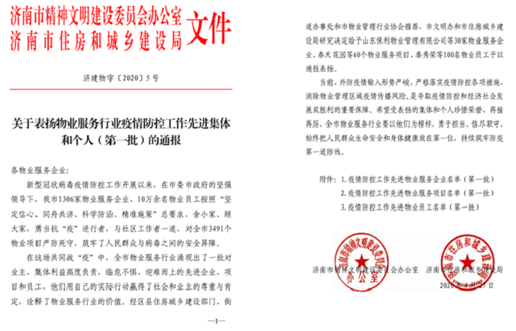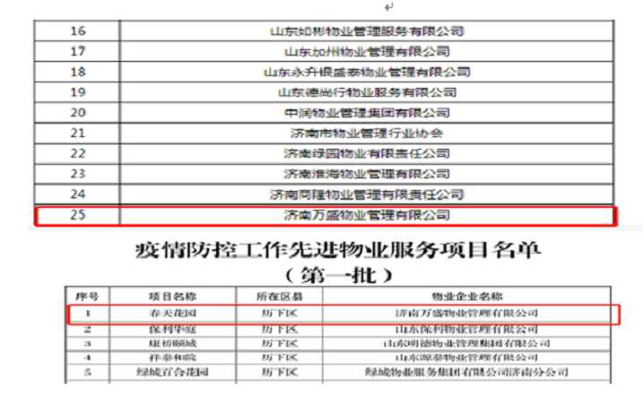 大會對疫情防控工作中的先進物業服務企業、先進物業服務項目、先進物業個人做出表揚和加冕,濟南萬盛物業管理有限公司榮獲“濟南市疫情防控工作先進服務企業”,春天花園、美林苑兩個項目榮獲“濟南市疫情防控工作先進物業服務項目”,王之清和高鵬飛榮獲“濟南市疫情防控工作先進物業個人”。