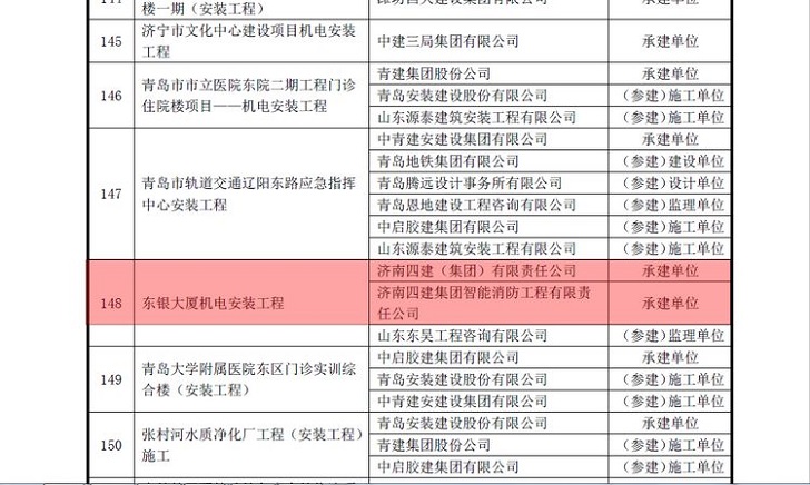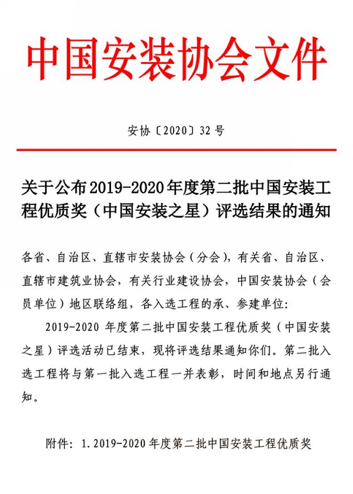 12月10日,2019-2020年度第二批中國安裝工程優質獎評審結果公示結束,由濟南四建(集團)有限責任公司、濟南四建集團智能消防工程有限責任公司承建的東銀大廈安裝工程榮獲中國安裝之星榮譽!“中國安裝之星”作為中國安裝行業工程質量最高獎,也是專為安裝企業設立的國家級工程質量獎項,被譽為“安裝行業的奧斯卡”,成為眾多安裝企業孜孜以求的最高榮譽。此次安裝之星獎項是集團和智能消防公司繼美林大廈、紅山園工程后的第三次獲獎。