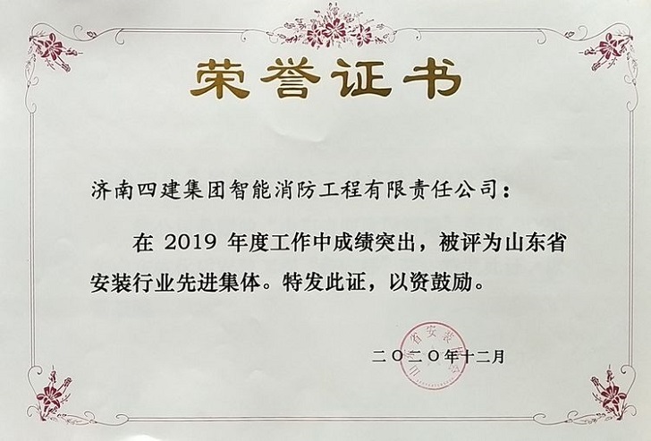2.濟南四建集團智能消防工程有限責任公司榮獲“山東省安裝行業先進集體”。