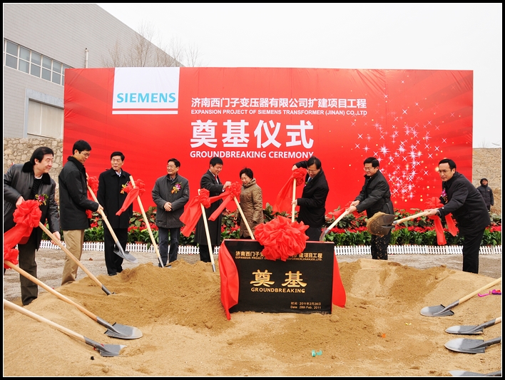 奠基儀式前,濟南市西門子變壓器有限公司總經理劉曉青首先對公司情況進行簡要介紹,并帶領大家參觀工廠。奠基儀式由濟南市西門子變壓器有限公司總經理劉曉青主持。集團公司董事長、黨委書記、總經理曹曉巖代表公司對該項目的建設致辭。曹總在致辭中說,濟南四建集團能夠作為該項工程的具體承建者,感到非常榮幸,同時深感責任重大。在接下來的施工中,四建集團將秉承“質量興業、精品報國”的企業理念,發揮集團作戰的優勢,精誠團結,全力以赴,以誠信為準則、優質為目標、節約為己任,精心組織、嚴格管理、安全生產、文明施工。隨后,奠基儀式開始,鞭炮齊鳴,樁基啟動,參加儀式的各位領導共同為濟南市西門子變壓器有限公司擴建項目奠基培土。