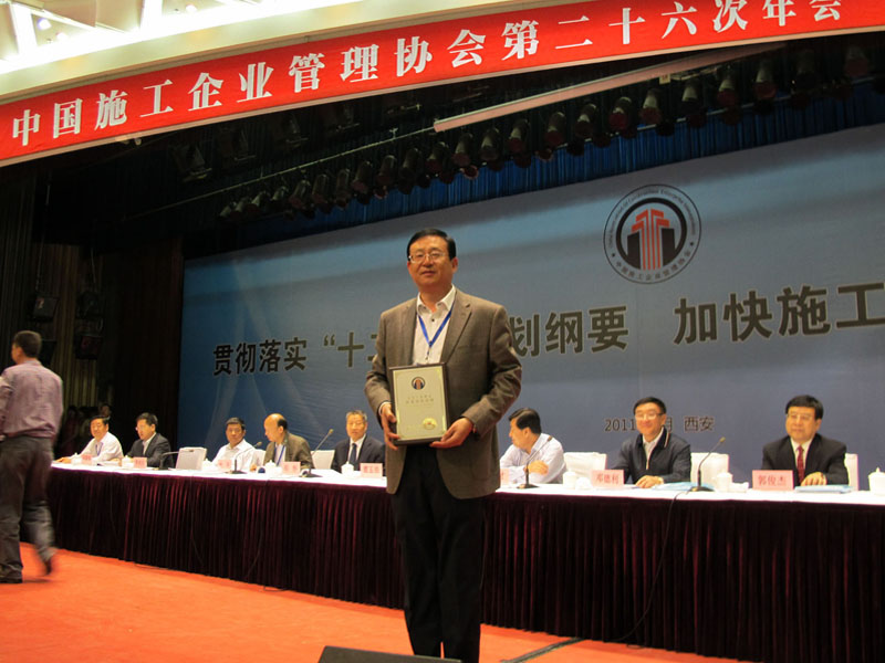 2011年4月28日中國施工企業管理協會第二十六次年會在陜西省西安市隆重召開;集團公司副總經理劉俊清同志代表常務理事單位參加了會議。我集團公司四一二項目部經理王勤本同志榮獲2010年全國工程建設優秀項目經理稱號。獲得此獎不僅是王勤本同志個人的榮譽;也會在全省乃至全國對進一步提高集團公司的榮譽度都有較強影響,也將激勵四一二項目部全體員工的創優熱情,再接再厲為集團公司“筑精品工程,樹四建品牌”再立新功。